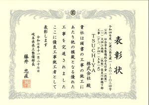 岐阜県県土整備部長より優良工事施工者表彰をいただきました