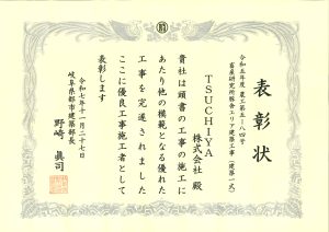 2025年11月27日に岐阜県都市建築部長 野崎 眞司様より優良工事施工者表彰をいただきました。これは下記の工事における品質を評価していただいたものです。